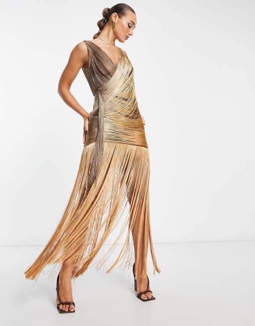 ASOS DESIGN fringe drape maxi dress with ombre in gold ASOS
